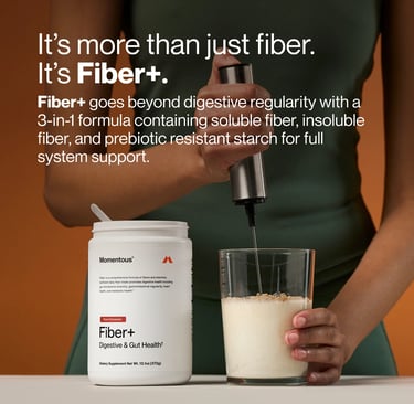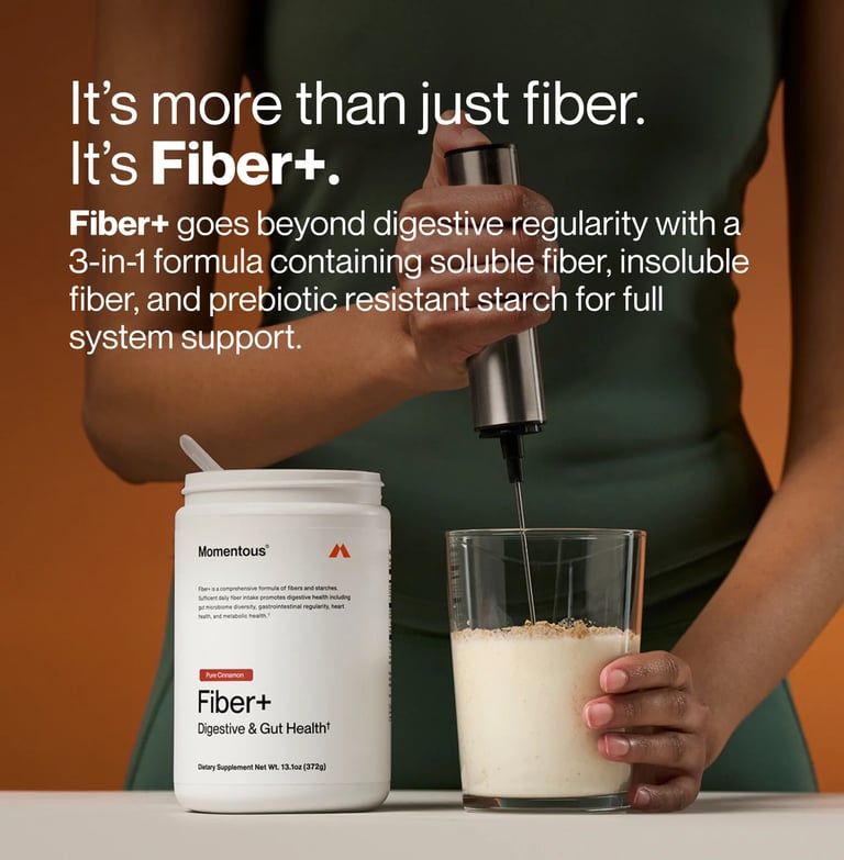 Breaking news!! I literally, like, as in 2 seconds ago, just found out that Momentous launched a new product yesterday called Fiber+! It has 6 grams of fiber per serving, and of course has The Momentous Standard backing it. Fiber+ delivers soluble fiber, insoluble fiber, and prebiotic resistant starch to activate gut health as the foundation for improved performance. For those on any form of GLP shot, this will be a significant help as far as some of the constipation and gut health are concerned. You have no idea how excited I just got, folks. I take some fiber gummies, but honestly, I'm looking for another source as I don't feel like they do much other than taste super good, since I'm on the honest route. However, they do taste wonderful, so a part of me is sad to be giving that up. Fiber+ comes in cinnamon and unflavored at the moment.